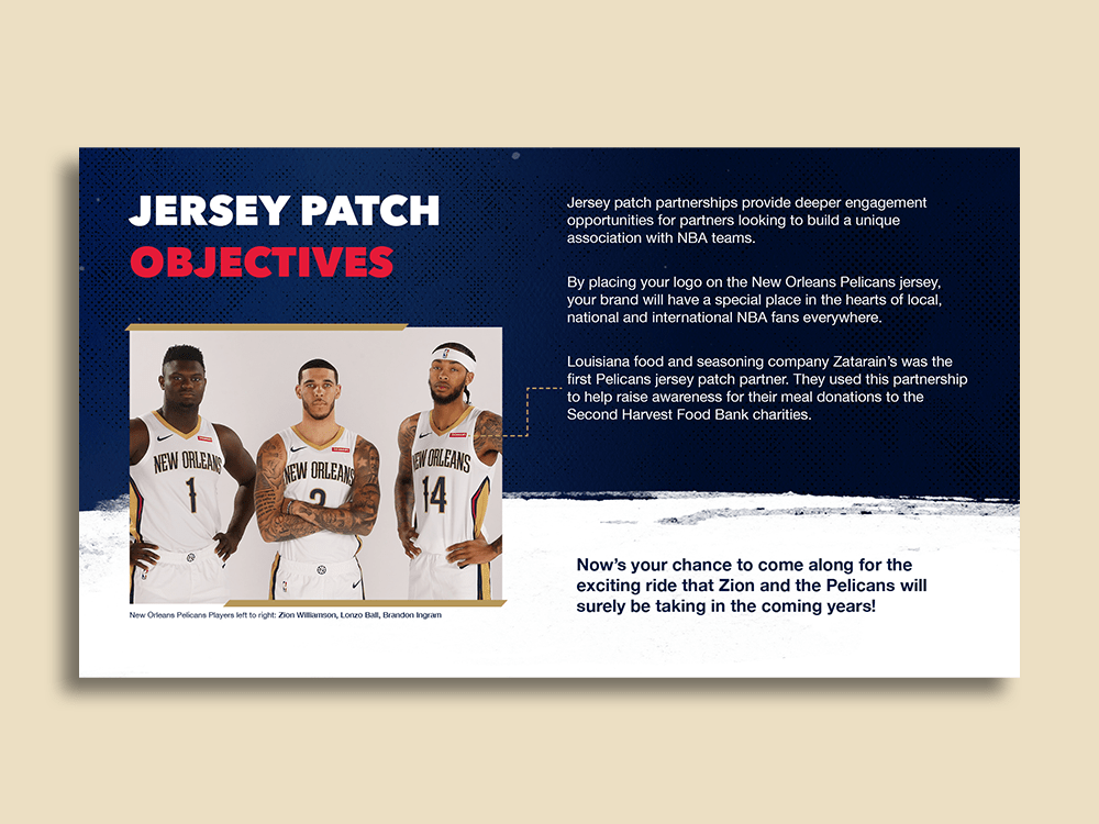 Sales pitch document created for Impression Sports & Entertainment (former Fox Sports affiliate). Used to convince potential clients to sponsor the jersey patch for the New Orleans Pelicans NBA team. This resulted in Ibotta’s New Orleans Pelicans Jersey Patch sponsorship for the 2020-21 season.